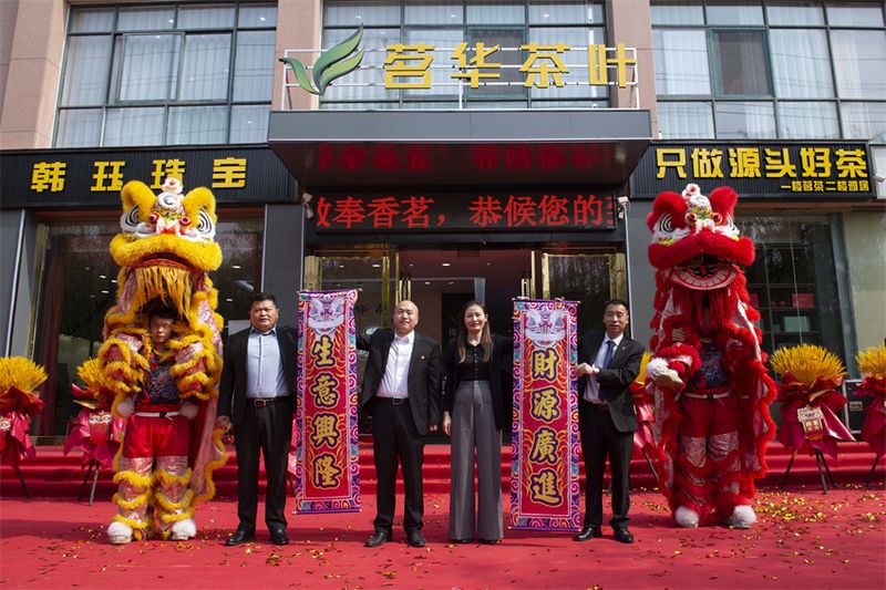集團黨委書記、執(zhí)行董事長李國強與集團總裁王海燕等領(lǐng)導(dǎo)共同為河南茗華茶業(yè)長垣旗艦店開業(yè)剪彩,并進行醒獅點睛。